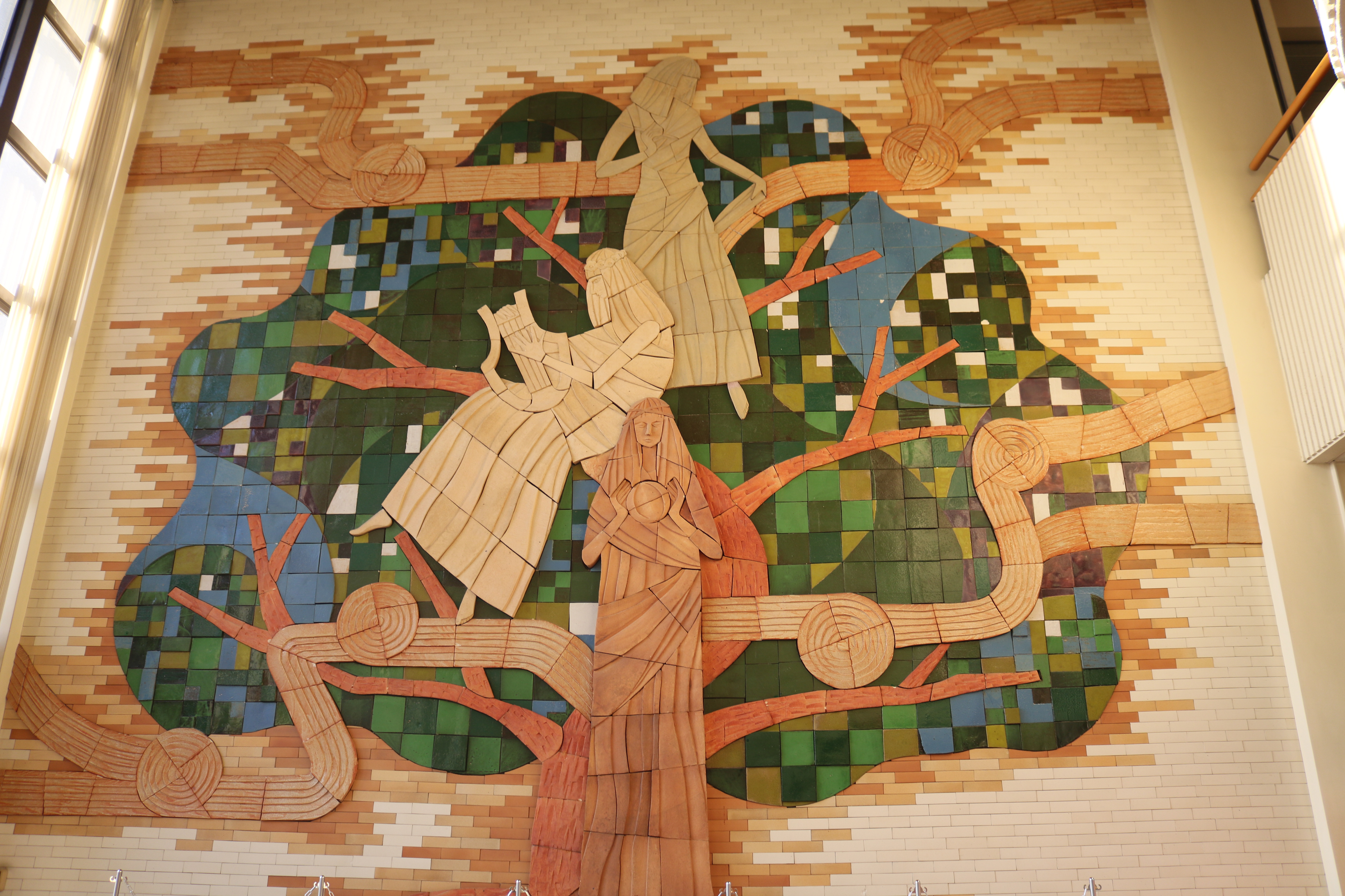 「教育」を象徴する女神たちに、被爆後にいち早く生命をよみがえらせ市民に希望を与えた楠を配し「広島